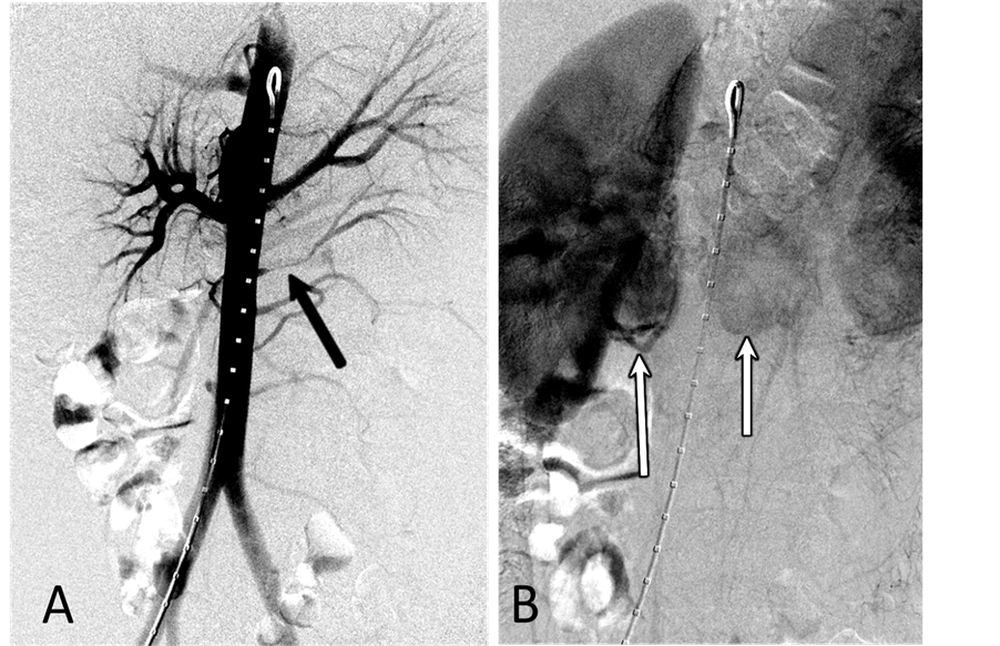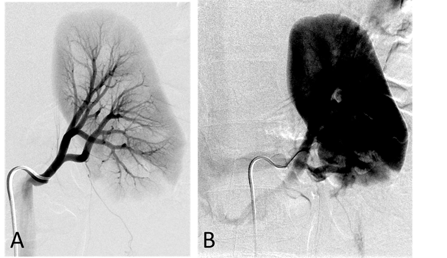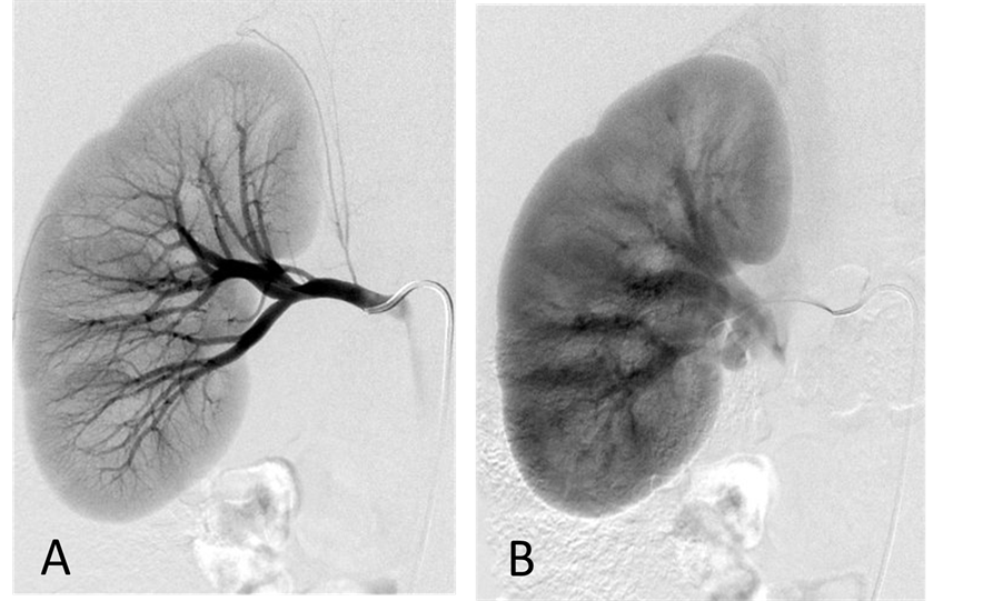 Figure 5. (A) Left renal arteriogram,arterial phase. The main and intrarenal arteries are patent; (B) Left renal arteriogram, capillary and venous phase. The nephrographic defect in the lower pole of the kidney is the part of the kidney supplied by the accessory renal artery arising from the aorta. There is circumaortic renal vein as renal vein variation.