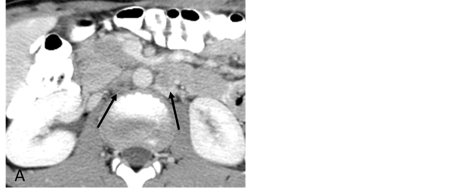 Arteriography is infrequently performed in patients with clinical and biochemical evidence of pheochromocytoma or functioning paragangliomas (extra adrenal catecholamine-secreting tumors collectively referred to as pheochromocytoms), given the advent of safe and accurate imaging modalities such as CT and MIBG scans. However, when the diagnosis is still equivocal, angiography with venous sampling is a highly sensitive and specific test that can be employed [7] . In this case, given: CT findings, negative MIBG scan, and history of abdominal trauma; the masses were first hypothesized to be retroperitoneal hematomas therefore leading to a delay in the correct diagnosis and treatment. Regardless of location, pheochromocytomas are usually hypervascular tumors exhibiting neovascularity and tumor stain. The cystic nature of the tumor or central necrosis of the tumor can demonstrate a central avascular zone surrounded by a dense rim of contrast accumulation, giving a “ring sign”. Functional paragangiomas may be found in chromaffin tissue throughout the body including; along the sympathetic chain, in the neck and thorax, along the wall of urinary bladder, the organ of Zuckerkandl (located inferior to the origin of the inferior mesenteric artery), and pelvis. High local levels of catecholamines can be found in the adrenal and renal veins and along the IVC, depending on the location of the tumors [8] . Generally, extra-adrenal pheochromocytomas secrete predominantly dopamine and norepinephrine, whereas adrenal pheo- chromocytomas secrete epinephrine. Given the extensive yet equivocal workup the patient received, adrenal and renal vein sampling was performed to determine the diagnosis of pheochromocytoma. The normalization of catecholamine levels 7 days post operatively and resolution of persistent hypertension further confirmed the diagnosis.