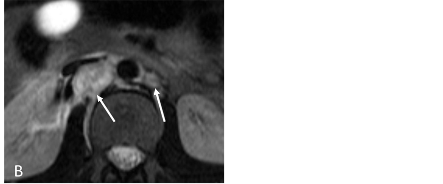 Figure 1. (A) Contrast-enhanced CT scan section through the kidneys showing two retroperitoneal masses (arrows); (B) On MRI the lesions have high signal intensity on T2-weighted images (arrows). The right retroperitoneal tumor is located posterior to the IVC and right renal artery.