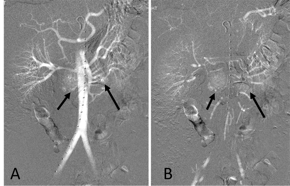 With the patient under general anesthesia, a 5-Fr Omni Flush catheter (Angio Dynamics, Queensbury, NY, USA) was placed in the aorta above the celiac axis from a percutaneous retrograde transfemoral arterial approach, and aortograms were performed, first with 30 cc of CO2 and then in the anterior-posterior (AP) and left anterior-oblique (LAO) projections with Visipaque (GE Healthcare, Cork, Ireland, UK). During each of the runs, there was a moderate increase in blood pressure from baseline systolic pressures of 120 s to 145 - 150 s, lasting 5 minutes, accompanied by bradycardia and transient arrhythmia. A nitroglycerin drip was started; however, the patient did not require any alpha or beta blockers. Next, a 5-Fr shepherd hook catheter (Angio Dynamics, Queensbury, NY, USA) was positioned and digital subtraction angiography (DSA) was performed, sequentially, in the right and left renal arteries, superior mesenteric artery, and finally the celiac axis. The aortograms revealed two vascular retroperitoneal tumors to the right and left of the aorta, at the level of L1-2, measuring 22 mm × 27 mm and 26 mm × 27 mm, respectively (Figure 2(A) and Figure 2(B)). The right retroperitoneal mass was located posteroinferior to the right renal artery and posterior to the inferior vena cava (IVC). The left retroperitoneal mass was located between the left main renal artery and the inferior accessory renal artery. The inferior accessory renal artery supplying the lower pole of left kidney showed diffuse narrowing due to either compression or catecholamine release by the tumor (Figure 3(A) and Figure 3(B)). Subsequently, bilateral renal arteriograms were performed without a hypertensive response to the injection of contrast material. The right main renal artery was displaced by the tumor with mild arterial narrowing (Figure 4(A) and Figure 4(B)). Left renal arteriogram showed a patent main renal artery with a circumaortic renal vein (Figure 5(A) and Figure 5(B)).