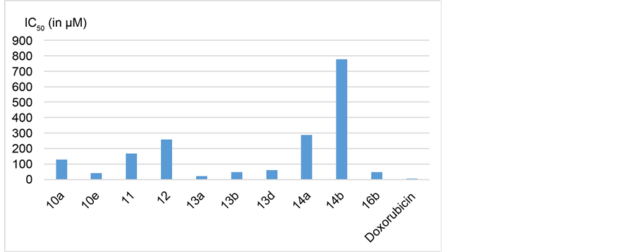 All of the newly synthesized derivatives were evaluated for antitumor activity by measuring the inhibitory effect of such compounds against human breast adenocarcinoma cell line MCF7 using MITT technique [21] [22] . The MTT Cell Proliferation Assay measures the reduction in cancer cell viability due to apoptosis or necrosis as a response to external factor. The yellow colored tetrazolium salt of MTT is reducible by the action of metabolically active cells, through dehydrogenase enzymes that leads to generation of NADH and NADPH reducing equivalents. The produced intracellular purple formazan can be solubilized and spectrophotometrically quantified [23] . The results of in vitro antitumor activity were compared with doxorubicin as a reference antitumor agent. The parameter used herein is the IC50, which represents the concentration needed for 50% inhibition of the cell viability. A relation between the IC50 values of the new compounds that showed more than 50% inhibition against MCF-7 and that of the reference antitumor agent is shown in Table 1 and represented graphically in Figure 2.