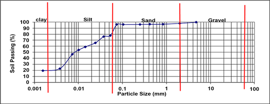 The particle size distribution of the soil corresponds to result of both dry sieving and hydrometer test (see Figure 2). It is observed that 58% of the soil passed through 0.06 mm sieve, indicating that the soil has a fine texture, according to ASTM. The fine texture of the soil confirms its high clay and silt content. Furthermore, it confirms why the soil has high liquid limit and plasticity index values which are not suitable for making soil bricks since this leads to excessive drying shrinkage, and low durability and compressive strength. In the way to reduce liquid limit and plasticity index, 25% of sand was added in the soil.