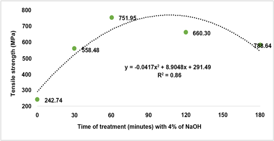 Figure 3 shows the relationship between tensile strength and duration of treatment of the fibres with NaOH solution. It can be seen that the tensile strength increased with the duration of treatment up to an optimum value of 766.9 MPa after 106.8 minutes, thereafter the strength decreased. A polynomial relation exists between tensile strength and duration of treatment with a strong correlation as the coefficient of determination (R2 = 0.86) is high. The tensile