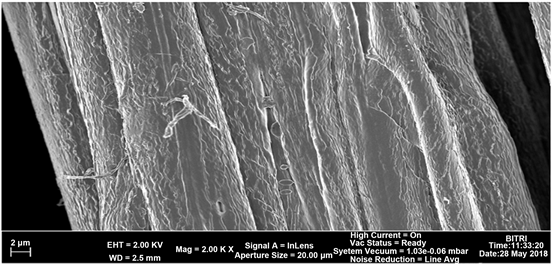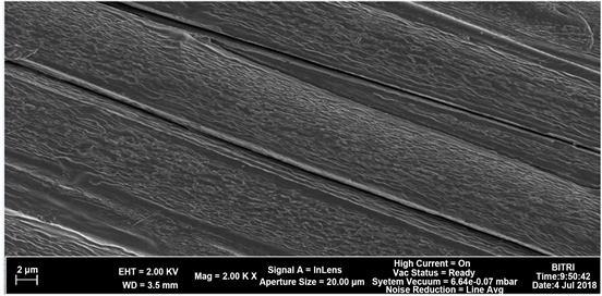 In order to assess the chemical properties and tensile strength of the PALF it was necessary to treat the fibres in a 4% of sodium hydroxide (NaOH) solution over various durations. The NaOH treatment is one of the best treatment used for natural fibres. It helps to increase the fibre surface roughness by chemically modifying and cleaning the fibre surface [5] . The 4% NaOH solution was prepared by dissolving 80 g of NaOH in 2000 cm3 of distilled water, because according to J. P. Siregar et al. PALF treated in NaOH concentration of 4% showed the highest mechanical properties value (Siregar, Sapuan, Rahman, & Zaman, 2010). Thereafter, four (4) samples of PALF, each weighing 70 g, were immersed in the NaOH solution for 30, 60, 120 and 180 minutes. The control treatment involved no immersion of the fibres in the NaOH solution, and this represented zero (0) minutes duration of immersion. The chemical properties (i.e., proportions of cellulose, hemicellulose and lignin) of the treated four (4) fibre samples were determined based the procedure described by Direct method of cellulose, hemicelluloses and lignin (Moubasher et al., 1982) [6] . Tensile strengths for all the samples were analysed using HOUNSFIED TENSOMETER machine as per the ASTM D 3822-07 standard. Scanning electron microscopy (SEM) analysis was carried out at the Botswana Institute for Technology Research and Innovation (BITRI), Botswana, with 2.0 K× magnification. The aim of the SEM test was to show the effect of NaOH solution treatment on PALF at optimum tensile strength.