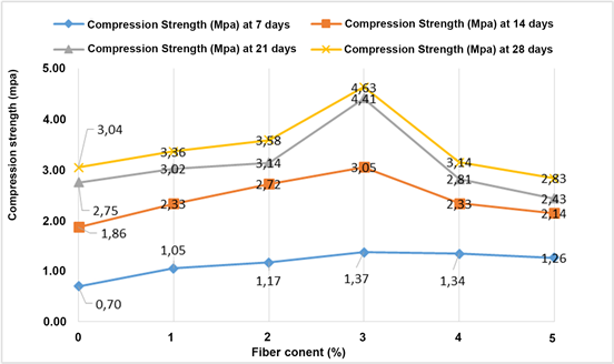 The relationship between the compressive strength of bricks stabilized with 3% cement and various proportions of T-PALF are shown in Figure 6. As in Figure 5, it is can be seen that the compressive strength of the reinforced bricks with T-PALF increased with increase of fibre content up to 3%, thereafter it decreased. According to the ACI Material, Journal Committee all the compressive strengths of the bricks reinforced with 0% to 5% of fibre content at 21 and 28 days of curing met the minimum threshold of 1.72 MPa. Similarly, the bricks with 2% to 4% of fibre content at 14 days of curing met this minimum threshold. The results also show that the compressive strengths of 3.81 and 4.01 MPa corresponded to 3% fibre content at 21 and 28 days of curing, respectively, hence, according to Tanzania Standard 283:1986 (TZS 283:1986) this mixture can be used for load bearing walls.