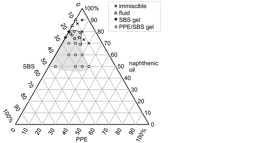 Mixtures of SBS, PPE, and naphthenic oil were prepared by blending at 190˚C for 20 min and cooling at ambient temperature. In this study, samples which did not flow 24 hours after inversing sample bottles at room temperature were defined as gels.