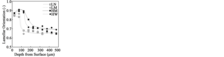 Figure 2 shows skin-core morphology of injection molded PP with different molecular weight and molecular weight distribution observed by POM. Near the center in ND direction, every samples had similar no anisotropy morphology (core layer). However, unique morphology as compared with the core layer were observed near the surface (skin layer named characteristic morphology layer). In low molecular weight samples, LN and LM, these samples had almost same thickness characteristic morphology layer and its thickness were about 70 μm. On the other hand, in high molecular weight samples, HM and HW, HM had a thicker characteristic morphology layer than HW and their thickness was about 120 and 100 μm, respectively. In comparison between LM and HM, it was found that high molecular weight caused the increase of characteristic morphology layer thickness. Moreover, from the results of HM and HW, a wide molecular distribution caused the increase of characteristic morphology layer thickness only in the high molecular weight sample.