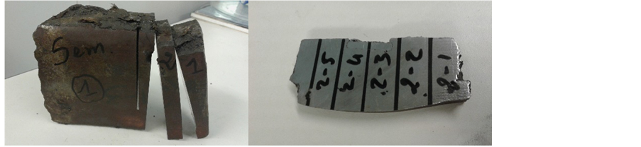 Analysis of the micrographs of Figure 3 shows that the brake blocks 1, 2 and the casting are made of gray cast iron having a grey appearance to fracture due to the presence of carbon mainly in the form of graphite [6] [9] [10] . As the brake block 3 is formed of a white cast iron have a white appearance to breakage. The carbon they contain is combined with the iron and form the carbide form called cementite.
