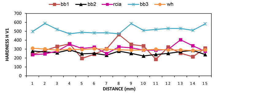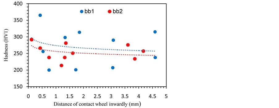 Microhardness profile due to friction with the wheel and block brake 1 and 2 is represented in Figure 5.
