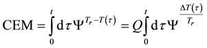where the treatment time t is conventionally measured in minutes. The general equivalent time CEM in Equation (18) does not fix the reference for one definite cell-death, it is general for all the cases when the Arrhenius process is valid.