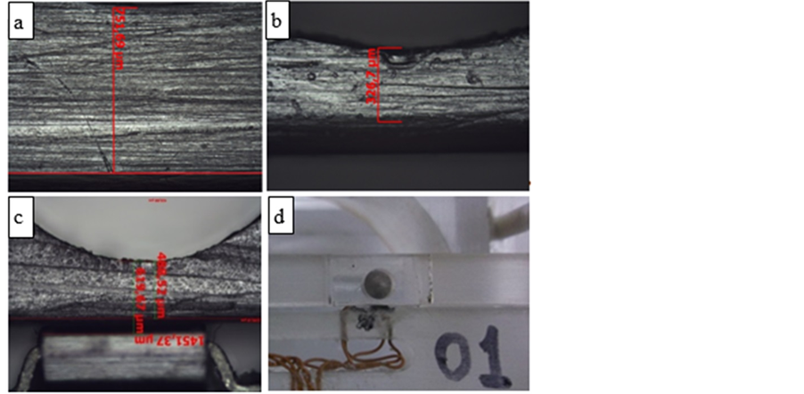 Figure 4. (a) Optical microscope measurement of the distance dz2; (b) Measurement of the distance dx2; (c) Measurement of the distance dz1; (d) Figure indicating the position of the sensor and the first cylindrical cavity with a nickel sphere.