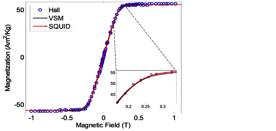 Figure 5 shows a comparison of the magnetization measurement results obtained with the Hall magnetometer (circles), the SQUID magnetometer (red solid lines), and the VSM device (black solid lines) for the same nickel sphere as a function of the applied field.