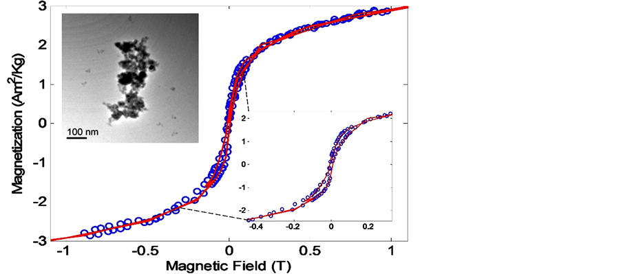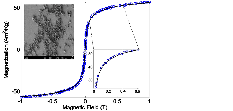 According to the results shown in Figure 9, we can verify the magnetization of nanoparticles of magnitude coated with silica from measurements using the Hall magnetometer (blue circles). We used a sample mass of 16.7 mg. The same sample was measured with a VSM device (model 4500, EG & G Instruments) (black solid lines). Comparing the two magnetization curves, we obtained a mean quadratic error of 1.3%. By analyzing the magnetization curve, we determined a magnetization remanence of 0.4 Am2/kg and a coercivity of 0.6 mT.