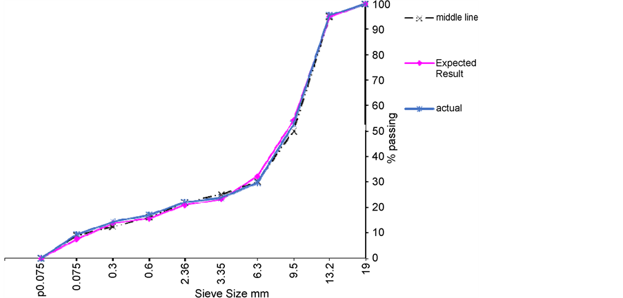 Figure 2 shows that the actual line for OGW is very close to the expected and middle line. The middle line is described as the median % passing range in each sieve size of OGW mix design given by LTA [7] . The actual line is below the expected line due to a lack of dust or fine aggregates. However the percentage error of the percentage passing within sieve size 0.3 mm to 3.35 mm is below 7% and applicable for OGW mix proportion.