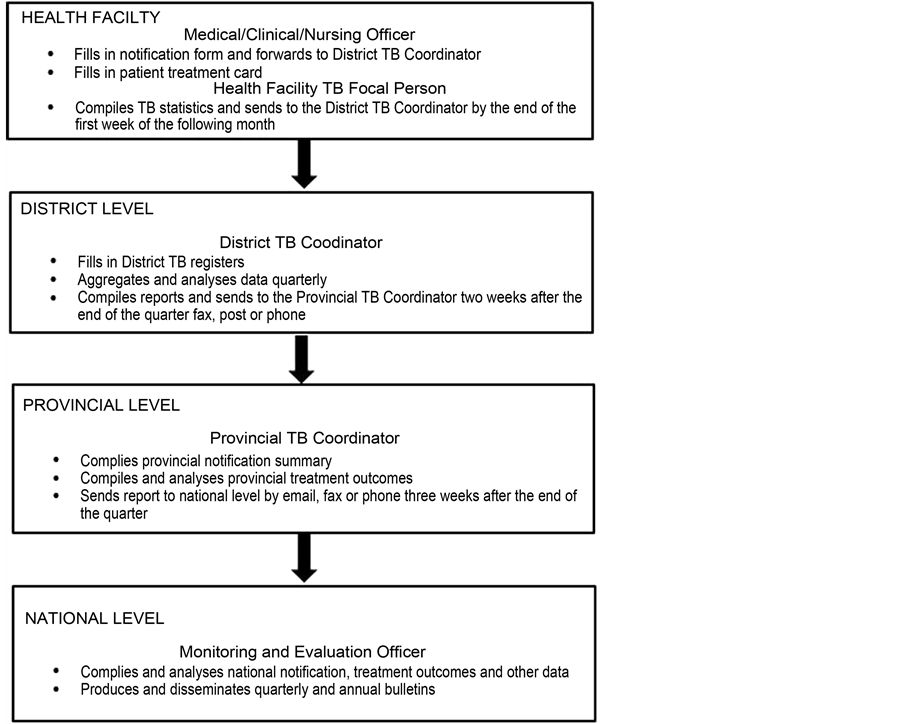 To be able track progress made in TB control and see if set targets such as the MDGs, have been met, a functional surveillance system is important. In Zimbabwe, the TB case notification system is part of routine disease surveillance. Data on case detection and treatment outcomes are reported. Figure 1 summarizes flow of data [7] .