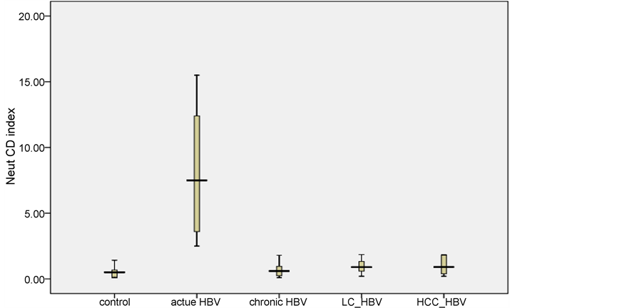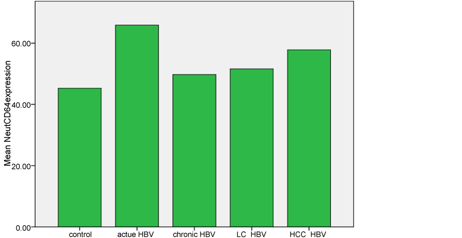inpatients with acute infection than other stages. Their values were significantly increasing from patients with chronic hepatitis to LC to HCC. Also, there was statistically significant difference in neutrophil CD64 index between patients with different stages of HBV infection (P value = 0.000 between groups). Patients with acute infection showed higher values than other stages, and its value was significantly increasing from patients with chronic hepatitis to LC to HCC. This is illustrated in Table 5 and Figures 2-5. Also significant higher values; for both expressions and neutrophil CD64 index, were detected in every stage of infection in comparison with control group (P value = 0.000).