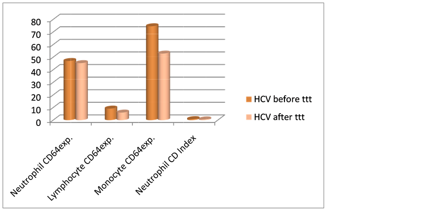 The level of CD64 expressions for neutrophil, lymphocyte and monocyte decreased significantly after direct acting antiviral therapy (P value = 0.000), also neutrophil CD64 index decreased significantly after therapy (P value = 0.000),