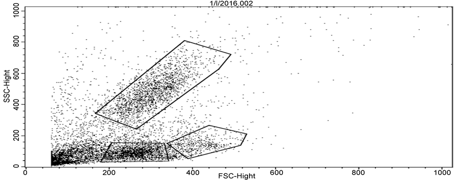 CD64 expression and by flow cytometry: CD64 expression was measured using FITC CD64 monoclonal antibodies as follow: 100 μL from blood samples and 10 μl of FITC CD64 conjugated monoclonal antibody or matched isotype controls was added each in prepared tube then vortex and incubated in dark for 15 min at room temperature. Following incubation, red blood cells lysing solution 1 ml; 1× (BD Biosciences) was added and incubated for an additional 10 min at room temperature. Cells were centrifuged at 3500 rpm for 5 minute. The pellet was washed twice with phosphate buffered saline and then they were suspended in BD Biosciences fluid sheath for analysis on a FACS Calibur flow cytometer, BD Biosciences. Acquisition and analysis were performed using cell Quest software. The acquisition and analysis of immuno-marked cells was Standardized for 10,000 events per sample. Lymphocytes, monocytes and neutrophil were gated in the R1, R2 and R3 region according to the characteristic linear forward and side scatter features. CD64 expression was evaluated on a logarithmic scale for three regions (Figure 1).