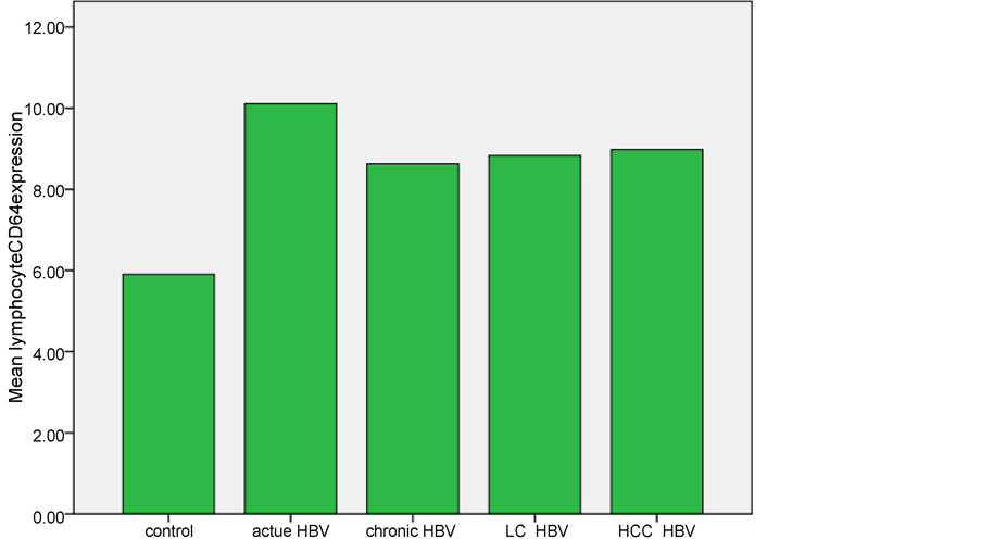 Figure 3. Mean lymphocyte CD64 expression in stages of HBV infection and in control group. All stages of HBV was higher than control group. Patients with acute stage showed the highest values and progressive increase from chronic stage to LC to HCC.