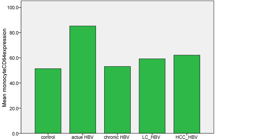 Figure 4. Mean monocyte CD64 expression in stages of HBV infection and in control group. All stages of HBV was higher than control group. Patients with acute stage showed the highest values and progressive increase from chronic stage to LC to HCC.