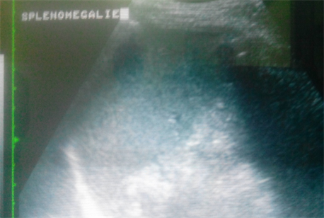 Abdominal ultrasound showed homogeneous hepatomegaly with a liver span measured at 140 mm (Figure 1) and splenomegaly (Figure 2), but signs of portal hypertension or cirrhosis were not detected.