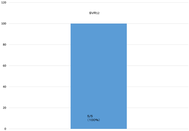 6 patients were available for total dose internal use. 6 patients were available for total dose internal use. As for the HCV RNA of the fourth week, (100%) HCV RNA became negative after administration start of therapy. Rapid virological response (RVR) achieved all cases (Figure 1). 5 patients achieve SVR12 and are following up the 1 patient (Figure 2).