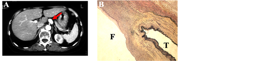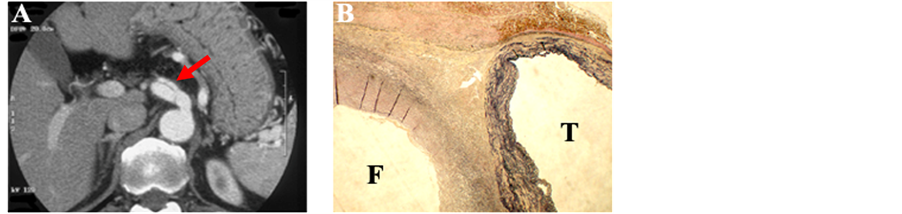 Figure 2. Case 2. (A) Abdominal CT with contrast injection showing an aneurysm of the celiac artery 18 mm in diameter. The presence of dissection is unclear; (B) Transverse section of the celiac artery at low magnification (Weigert staining revealing elastic fibers). The cleavage plane is located in the elastic layer which is thick with chronic change. T, True lumen; F, False lumen; (×10).
