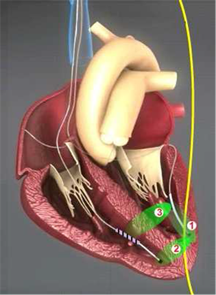 Figure 1. Available pacing vectors. 1. LV tip - LV ring; 2. LV tip - RV ring; 3. LV ring - RV coil. LV―left ventricular, RV― right ventricular.