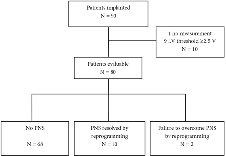 Of the 90 patients implanted, 9 patients had an LV threshold > 2.5 V and in one patient, the PNS threshold was not tested; therefore 80 patients were eligible for the primary endpoint. Out of the 80 evaluable patients, 68 patients did not experience any PNS, while 12 patients experienced PNS.