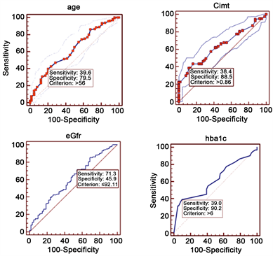 Patient’s age > 56 years, (AUC = 0.622), CIMT > 0.86 mm (AUC = 0.642), HbA1c > 6, (AUC = 0.620), eGFR < 92 ml/min/1.73 m2 (AUC=0.601) were the cutoff values obtained by ROC curve analysis for predicting CAD on coronary angiograph (Table 5 and Figure 2).