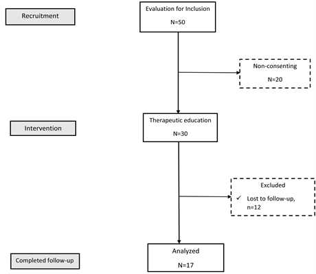 The present study has some limitations that need to be highlighted. Despite the fact that the sample size was calculated in order to detect any existing effect, the small sample size of our study could be an impediment for the generalization of these results. Another limitation of this study was the absence of a control group that could allow a better quantification of the real effect of our intervention. Also, the short duration of the study could be a limitation since most studies using such interventions usually found greater improvements during the first weeks of the study, but these results tend to be reduced with time. Therefore, the important effects found in our study should serve as base for the design of randomized controlled trials using therapeutic education as the main intervention, with a larger sample size, and longer follow-up to generalize our results to the entire population.