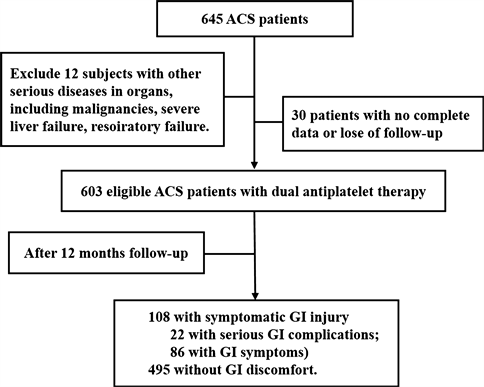 The flow chart is shown in Figure 1. According to inclusion criteria, a total of 645 ACS patients who received DAPT were screened. Of these candidates, 12 patients experienced other serious diseases in organs (including malignancies, severe liver failure, and respiratory failure) and 30 had incomplete data or were lost to follow-up during the study period. Ultimately, 603 eligible patients were enrolled. During the hospital, demographics characteristic of patients was collected by a case report form (CRF). When discharged, notices were given to the patients to remind them to inform the doctor if GI symptoms happen. GI symptoms include dyspepsia, diarrhea, abdominal pains, heartburn, acid regurgitation, sucking sensations in the epigastrium, nausea and vomiting, abdominal distension, eructation, which were listed on the notice. In addition, telephone follow-up was also conducted every month to reduce the impact of poor compliance. GI examinations such as endoscopy, colonoscopy, ultrasonography were carried out in all patients who suffered uncomfortable GI symptoms in time. The GI events and use of antiplatelet drugs were followed up after discharge for one year. Finally, the results of diagnosis, occurrence time came from phone interview, outpatient clinic record review, and readmission records review, were added in the CRF.