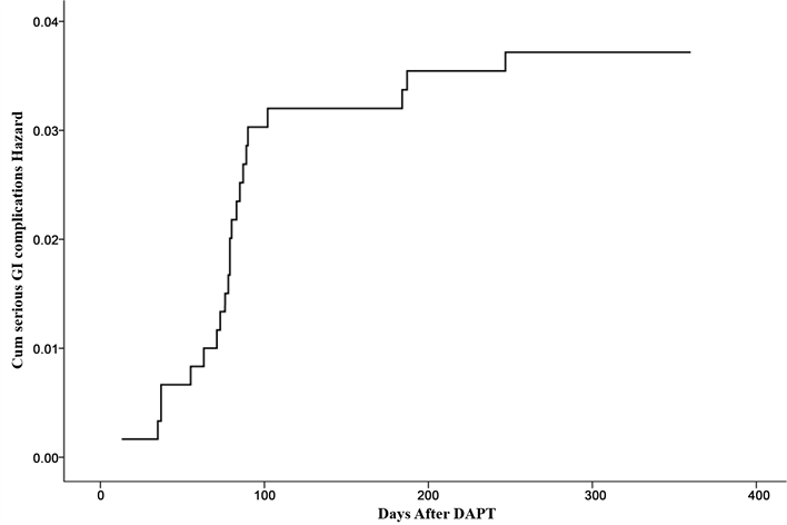 Several studies describe the incidence of GI injury in patients taking DAPT. The incidence of GI bleeding was 2.7% during the DAPT therapy or within 7 days of stopping enoxaparin in NG’s study [11] . In another study, 1.2% of patients developed UGIB in the 30 days following PCI [12] . In our study, the occurrence of serious GI complications was 3.65%, which is higher than in the other studies [9] [11] [12] . One reason for this is that serious GI complications in our study included GI ulcers, bleeding, perforation, etc. And another is that we conducted a one-year follow-up, which is much longer than the 7 or 30 days in these two studies.