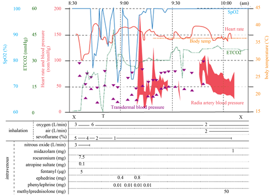 Figure 1. Record of the general anesthesia performed on a 5-month-old infant demonstrating anaphylactic shock during anesthesia induction. X, start and end of anesthesia; T, intubation.