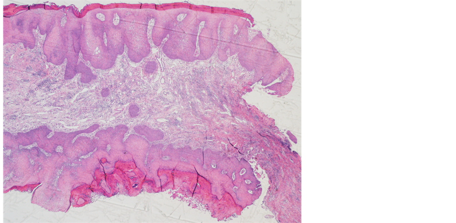 Figure 2. It revealed masses of squamous epithelium, demonstrating trichilemmal keratinization, extensive eosinophilic amorphous ketatin, and keratin pearls (Hematoxylin-eosin stain; original magnification ×12.5).