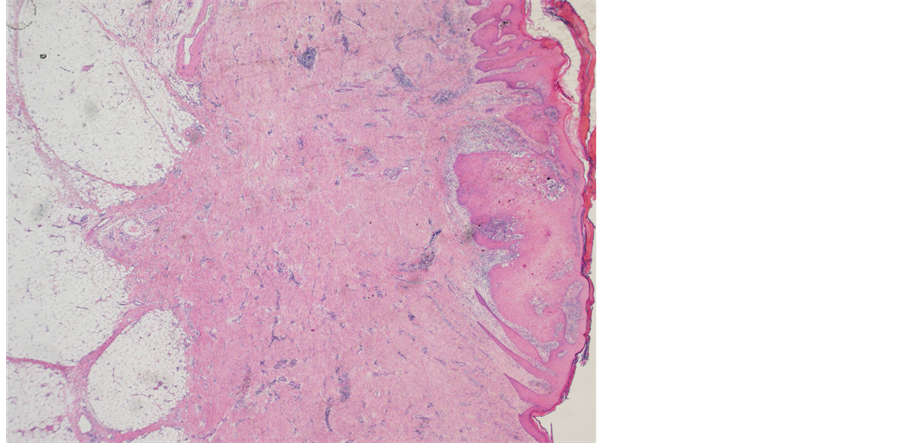 Figure 4. The remaining skin legions showing spontaneous regression were replaced by granulation tissue with infiltration of inflammatory cells (HE; ×12.5).