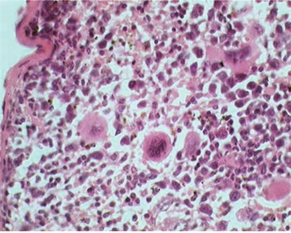 Figure 2. Spleen of mice 7 days PI, showed depletion of the lymphocytes with some large mononuclear as well as multinuclear cells. H & E. ×160.