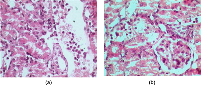 Kidneys of mice showed degeneration, necrosis and desequmoated epithelial cells of renal tubules combined with congestion and mononuclear cells infiltration (Figure 4(a) and Figure 4(b)). Moreover, emphysema, peribronchial congestion as well as various degree of mononuclear inflammatory cells infiltration were seen in lungs of mice (Figure 5(a) and Figure 5(b)).