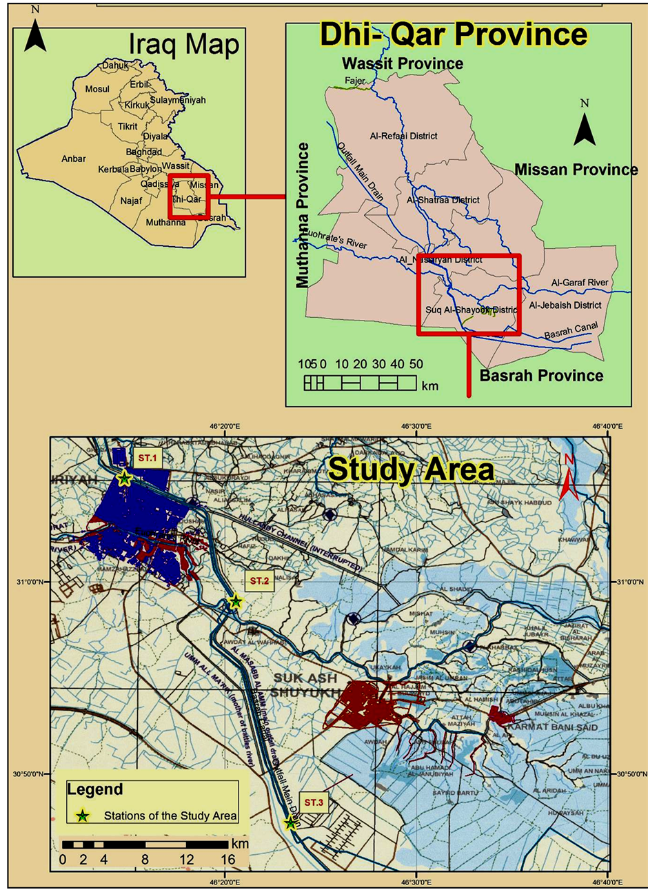 Three stations were selected in the south sector of this River to implement the present study. Station 1 (St.1) was located near Al-Holandee bridge and it’s the general carriage way in the center of Al-Nassiriya city, St.2 was 20 km far from the first station, while St.3 was located the beginning of the new branch (Figure 1).