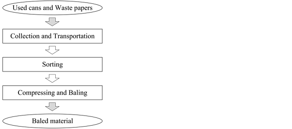 The system boundary for the recycling services includes the three unit processes: 1) collection and transportation, 2) sorting, and 3) compressing and baling), as shown in Figure 1. On the basic rules of “General Principles” and “Basic instructions” of CFP [7] [8] , the process 1), 2) and 3) correspond to (a) Raw material acquisition stage as 1) and (b) Production stage as 2) and 3), respectively,