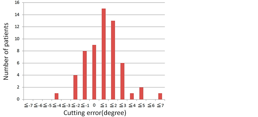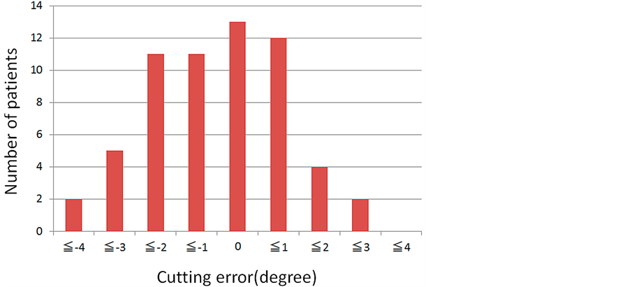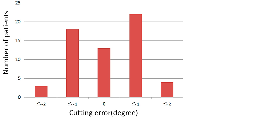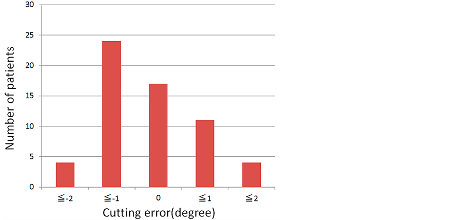 There are four limitations in our study. First, we operated with the same team, but with more than one surgeon. Previous studies conclude that cutting errors are independent of the surgeon’s experience [8] [19] . However, if we desire a more precise evaluation, we should operate with only one surgeon. In addition, we did not consider which side was deformed, we did not look at methods of skin incision, and we did not consider which hand was used to perform the bone cutting. These factors have a strong effect on cutting errors; they should be considered in order to evaluate cutting errors more precisely.