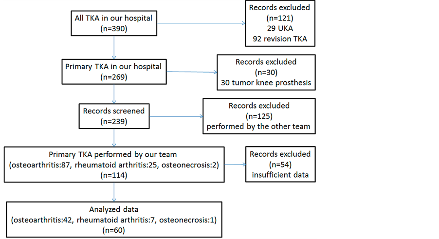 From February 2006 to March 2013, we performed 390 TKA and UKA in our hospital. In this study, we investigated only primary TKA by same team. Exclusion criteria included UKA, revision TKA and tumor knee prosthesis. 29 UKA, 92 revision TKA and 30 tumor knee prosthesis were excluded. Moreover 125 were also excluded because not performed by our team. Out of 114 primary TKA, 54 had incomplete data. The analysis was conducted on 60 primary TKA implanted in 50 patients (8 men and 42 women).The average patient’s age was 72.5 years (range 50 - 89 years). The diagnoses for all patients were 42 knee osteoarthritis, 7 rheumatoid arthritis and 1 osteonecrosis (Figure 1). We used an image-free navigation system (Navigation: Stryker Navigation Cart System, Software: Stryker Knee Navigation Ver2.0: Stryker Orthopaedics US NJ Mahwah) in all cases at the time of the surgery. The saw blade was 1.27 mm thick and 18mm wide, and the slot thickness of the cutting block was 1.40 mm.