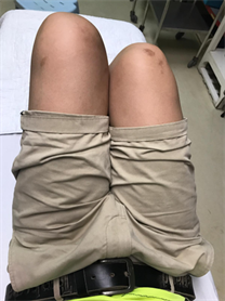 Figure 1. Initial presentation of 5 cm longer limb length discrepancy over the left leg with valgus deformity of the left knee.