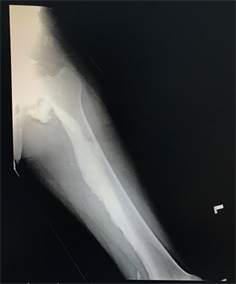 This is a 26-year-old gentleman who presented to our out-patient clinic with a history of left knee deformity for four years associated with gradual pain, swelling and stiffness over left knee and leg progressively worsening for past six months. No recent trauma/fall to suggest a possible traumatic cause. Clinically the left knee has mild valgus deformity and limb length discrepancy of 5 cm longer compared to the contralateral lower limb, with multiple ill-defined non-tender hard swelling over the anteromedial aspect of the left knee (Figure 1). Further examination showed discrepancy of the left femur bone as the causation of the significant limb length difference (Figure 2). Hyperpigmentation was also noted over the entire length of the left leg. Range of motion of the left knee was slightly limited due to pain. All blood parameters including serum calcium, alkaline phosphatase, C-reactive protein and erythrocyte sedimentation rate were within normal limits.