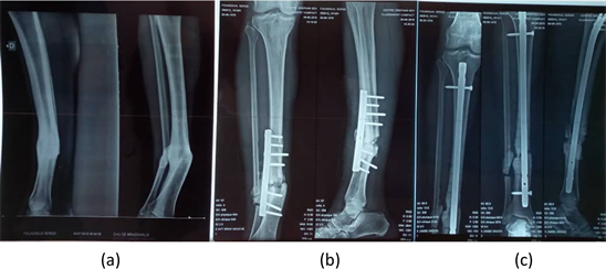 Figure 1. (a) X-ray of the leg before the operation; (b) Non anatomical alignment managed by screwed plate; (c) Early reoperation with replacement of the screwed plate by an intramedullary nail.