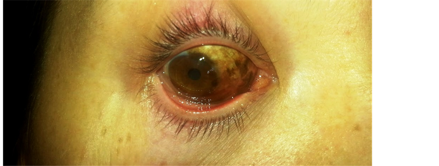 Slit-lamp examination showed the dark colored lesion in her right eye that involved complete bulbar conjunctiva in superior and inferior nasal quadrants, perilimbal parts of cornea and caruncula (Figure 1).