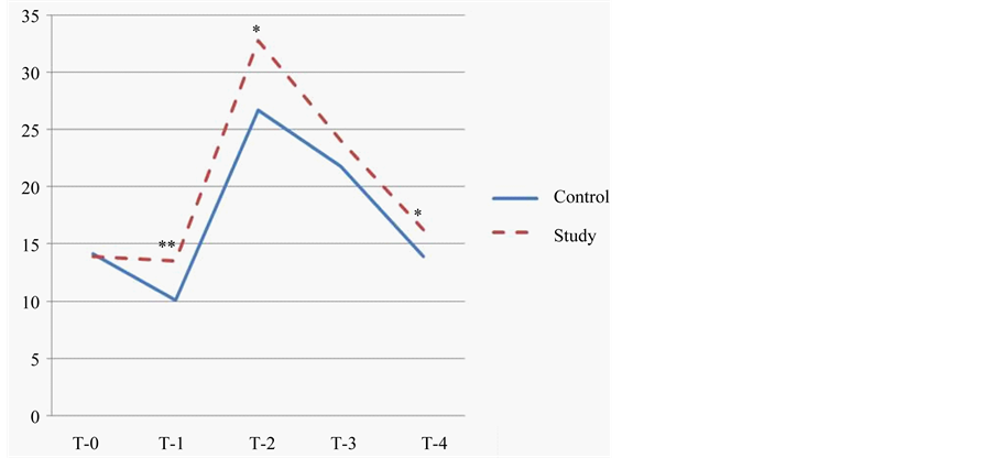 Figure 1. This figure illustrates the trend of IOP (intraocular pressure) over time in the study and control groups. The time intervals are baseline (T-0), immediately before the injection (T-1), immediately after the injection (T-2), 5 minutes after the injection (T-3), and 15 minutes after the injection (T-5). The IOP was significantly lower in the study group compared to the control group at T-1 (p < 0.01), at T-2 (p < 0.05) and at T-4 (p < 0.06); *p < 0.05; **p < 0.01.