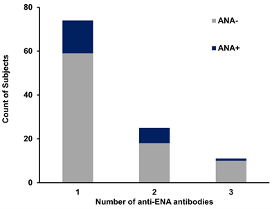Figure 1. Out of 110 subjects who were ANA negative but had anti-ENA antibodies (ANA−/ENA+), 23 subjects (20.9%) sero-converted to ANA positive and continued to have anti-ENA antibodies (ANA+/ENA+) in two years.