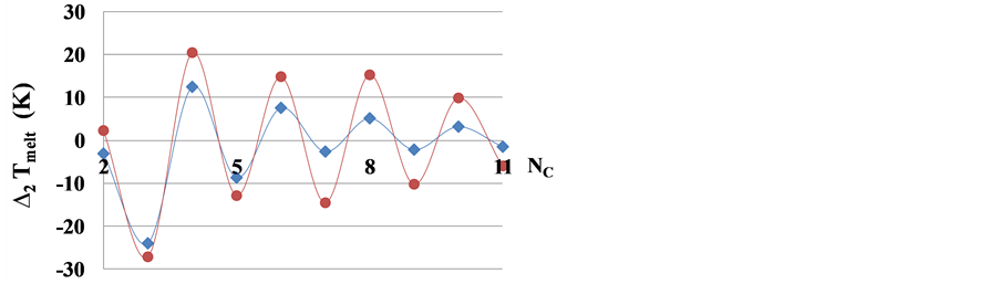 Figure 9. The second differentials of the melting point ∆2Tmeltn versus the number NC of carbon atoms in a molecule for n-alcohols (blue rhombs) and n-alkanes (red circles).
