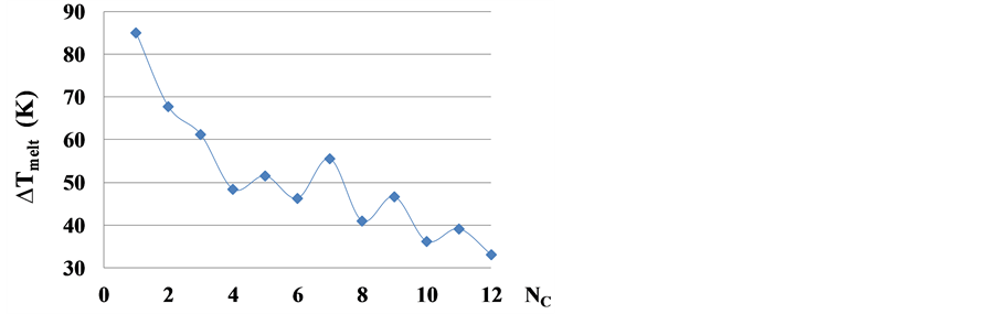 The zigzag oscillations of the Tmelt(NC) in n-alcohols demonstrate a strong contribution of the n-alkyl tails in the bond energy of molecules in a liquid state. These oscillations are also clearly seen for numbers NC of carbon atoms in a molecule larger than 12, Figure 11, based on experimental data of NDCDDI. But here we meet a new phenomenon―the change of the oscillation phase, clearly seen at the Figure 11.